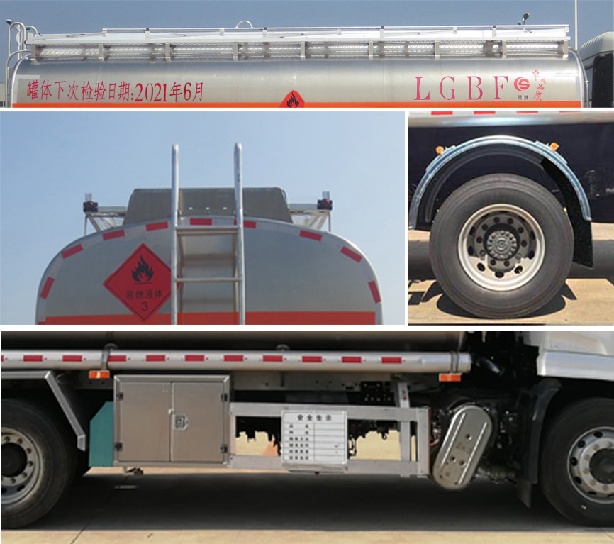 配置  1、該車適用于危險品運輸,運送危險貨物車輛類型為:FL型,類項號:3。罐體有效容積:16.6立方米,運輸介質:汽油,密度:700千克/立方米,罐體外形尺寸(長×寬×高)(mm):5700×2300×1600。2、側/后防護材料為鋁合金,螺栓連接。后防護截面尺寸120×60mm,下邊緣離地高500mm。罐體上部選裝上走道,選裝弧形擋泥板,選裝右側防護樣式。3、僅采用軸距(mm):4700。后軸采用空氣懸架。隨底盤選裝駕駛室前面罩,選裝側窗玻璃;駕駛室頂部中間三個裝飾燈為選裝件;前霧燈為選裝件;駕駛室前臉擾流罩為選裝件。僅選用排氣管前置、限速裝置(限速80km/h)、前輪盤式制動及子午線輪胎的底盤;安裝帶有衛星定位功能的行駛記錄儀;ABS型號/生產廠家:3631010-C2000/東科克諾爾商用車制動系統(十堰)有限公司。采用的發動機與油耗值(L/100Km)對應關系為: B6.2NS6B210/26.5,DDi50E190-60/23.9。 該車后軸為采用空氣懸架.轉向輪安裝輪胎爆胎應急防護裝置。該車型可選裝ETC車載裝置.