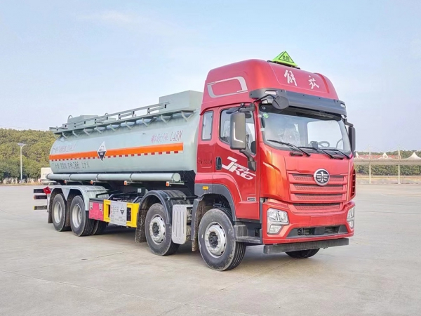 其它:該車為危險品運輸車輛.危險貨物運輸車輛的車輛類型為AT型車輛.罐體總容量:18.6立方米,罐體有效容積:17.7立方米,準運介質的最大密度1100千克/立方米.罐體外形尺寸(總長×直徑)(mm)為8200×1800.側、后防護裝置材質均為Q235B,連接方式均為:螺栓連接;后下部防護裝置,斷面尺寸(mm):130×50,下邊緣離地高500mm.僅選用軸距(mm):1900+3800+1350.發動機與油耗值(L/100km)對應關系為:CA6DK2-35E65/35.60,CA6DLD-29E6/37.75;該底盤排氣管前置,安裝前盤制動,安裝子午線輪胎,隨底盤安裝限速裝置,限速79km/h;安裝具有衛星定位的行駛記錄儀,安裝EBS,EBS系統控制器生產企業/型號為克諾爾制動系統(大連)有限公司/EBS5.該車后軸為采用空氣懸架;該車型可選裝直接供電ETC車載裝置;轉向輪安裝爆胎應急防護裝置.