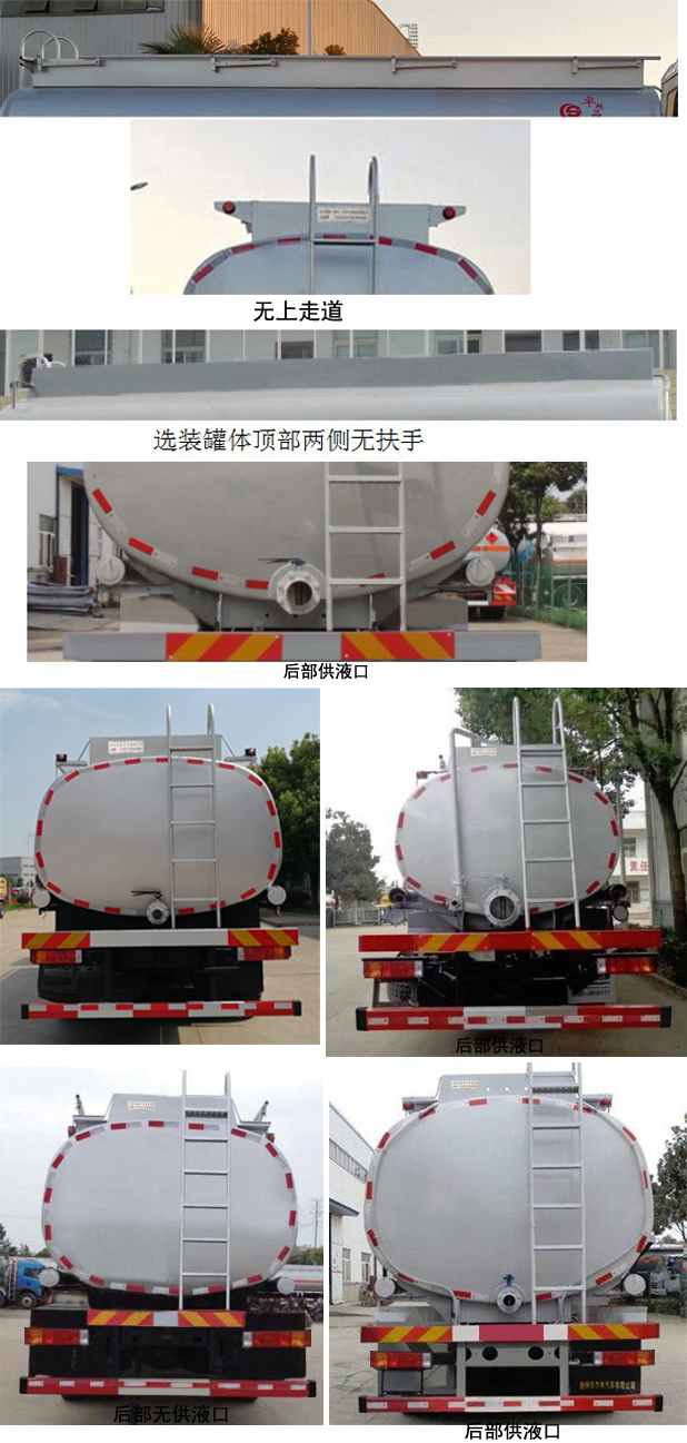 | 備注 | 隨底盤(pán)選裝同系列駕駛室,選裝進(jìn)氣口樣式。選裝罐體上部無(wú)上走道,有扶手或無(wú)扶手,后示廓燈架樣式;選裝罐體后部供液口閥門(mén)。 |