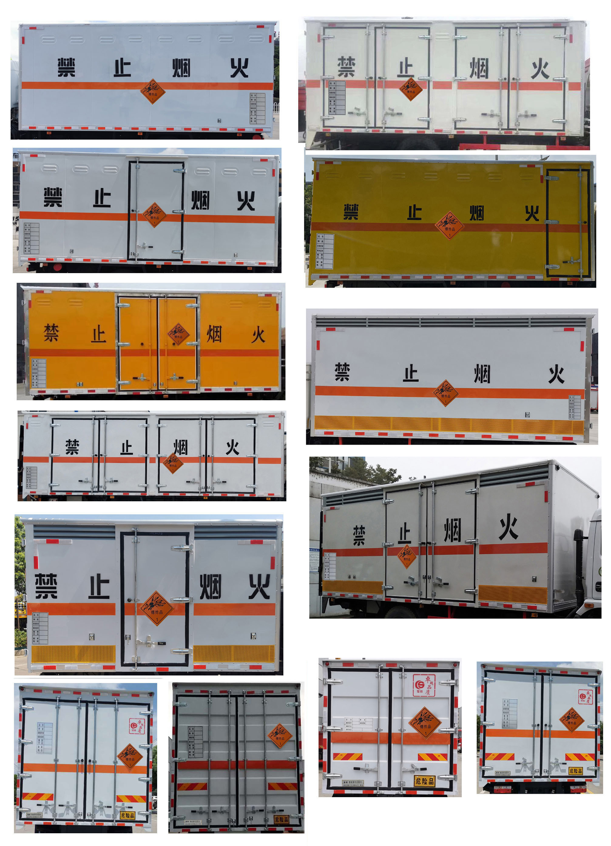 配置  1、該車適用于運輸危險品。運輸具有**容器(瓶)包裝的物品,EX/Ⅲ型車輛,危險貨物類項號:1.1B,1.1G,1.3C,1.1D,1.2D,1.3C,1.1C,1.4G。廂體頂部封閉不可開啟。2、側/后防護材料為Q235,側防護螺栓連接,后防護焊接,截面尺寸(mm)120×50,下邊緣離地高490mm。3、隨底盤選裝駕駛室前面罩,選裝側窗玻璃;駕駛室頂部中間三個裝飾燈為選裝件;前霧燈為選裝件;駕駛室前臉擾流罩為選裝件。僅選用排氣管前置、限速裝置(限速80km/h)、前輪盤式制動及子午線輪胎的底盤;轉向輪安裝輪胎爆胎應急防護裝置。后軸采用空氣懸架。安裝帶有衛星定位功能的行駛記錄儀,EBS型號/生產廠家:EBS3/威伯科(上海)管理有限公司。發動機與油耗值(L/100Km)對應關系為: B6.2NS6B210/26.5,DDi50E190-60/23.9。整車外形長/軸距/前懸/后懸的對應關系為(mm):8650/4700/1430/2520,9050/5000/1430/2620,9250/5000/1430/2820,10000/5800/1430/2770。4、該車型可選裝ETC車載裝置。廂體側面選裝開門型式及位置,選裝不帶側開門,選裝瓦楞板結構;廂體側面板選裝開百葉窗。