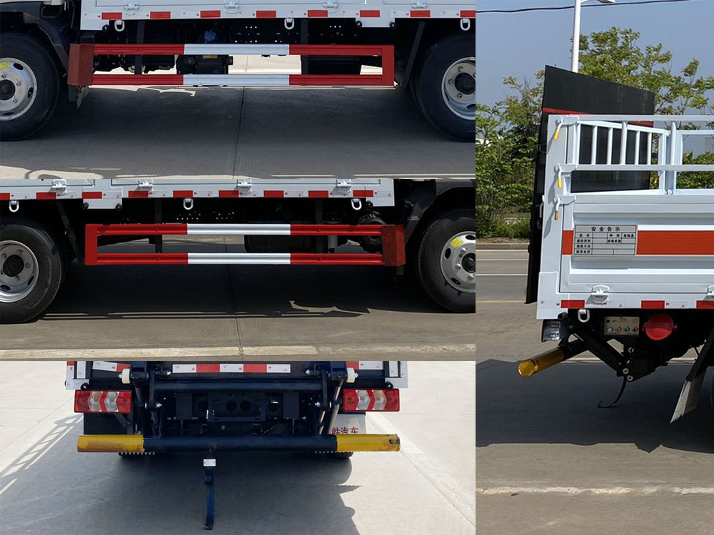其它:該車適用于運輸危險品。類項號:2.1,2.2。該車用于運輸具有獨立容器(瓶)包裝的物品。側,后防護材料均為Q235,螺栓連接,后防護截面尺寸φ100mm,下邊緣離地高450mm;選裝后部無尾板時,后防護材料為Q235,焊接,截面尺寸(mm):100×50,下邊緣離地高450mm。選裝欄板樣式。僅選用排氣管前置、限速裝置(限速80km/h)、前輪盤式制動及子午線輪胎的底盤;轉向輪裝備輪胎爆胎應急防護裝置。安裝帶有衛星定位功能的行駛記錄儀。ABS型號/廠家為:CM4XL-4S/4M /廣州瑞立科密汽車電子股份有限公司,VIE ABS-Ⅱ/浙江萬安科技股份有限公司。發動機/油耗值(L/100Km)對應關系為:WP2.3NQ130E61/10.83。尾板收起狀態水平長度為280mm,尾板質量為350kg。選裝ETC。整備質量含備胎,滅火器及隨車工具;貨廂重量為420kg,材質/厚度:底板, T700/1mm;墻板, Q235/1mm。