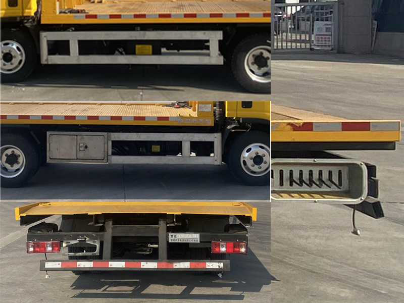 其它:該車主要用于道路清障,主要專用裝置為平板、絞盤、鋼絲繩、油缸。該車無托舉功能。側(cè)防護材料為鋁合金,螺栓連接;后防護材料為Q235,焊接,截面尺寸100×50mm,離地高度460mm。ABS型號/廠家:VIE ABS-II/浙江萬安科技股份有限公司。