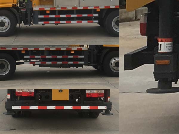 配置  該車用途為搶修電力、通訊、路燈等高空作業,主要裝置為升降平臺,作業臂。側、后防護材料均采用Q235,側防護螺栓連接;后防護焊接,截面尺寸100×50mm,下邊緣離地高450mm。隨底盤選裝前面罩,前保險杠,前組合燈具。ABS型號/廠家:ABS/ASR-12V-4S/4M/襄陽東風隆誠機械有限責任公司。