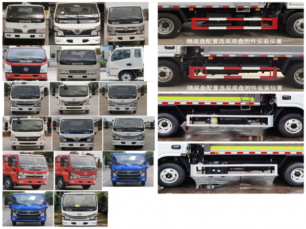 其它 | 該車主要專用裝置由箱體、壓縮系統組成,用于垃圾的收集與清運.側防護材料為冷彎型鋼/Q235,螺栓連接;后防護由專用裝置代替,下邊緣離地高450mm.選裝方形或弧形車箱;選裝箱體與駕駛室之間多路閥、液壓油箱、液壓管布置;選裝箱體前端爬梯位置;選裝電瓶位置;選裝多路閥罩;選裝填裝器外罩;選裝后密封蓋裝置.選裝不同工作裝置時外形長/后伸(mm)對應關系:①無上料裝置:6500/0,②擺臂裝置:6650/150,③全密封斗裝置:6650/150, ④半密封斗裝置及⑤翻桶裝置:6900/400.發動機與油耗值(L/100km)的對應關系為:CA4DB1-11E6/16.3,CY4BK161/16.2,CY4BK461/16.2,D20TCIF1/16.3,D20TCIF11/16.3,YCY24140-60/16.3,ZD30D16-6N/16.3,H20-120E60/14.9,Q28-130E60/15.9,CA4DB1-13E6/16.2,Q23-115E60/14.5.隨底盤選裝前面罩,前保險杠,前組合燈具,選裝排半駕駛室,選裝左右油箱位置,隨底盤配置選裝底盤附件安裝位置.僅選用軸距3308mm底盤改裝.選裝直接供電式ETC車載裝置.ABS型號/生產企業:ABS/ASR-12V-4S/4M/襄陽東風隆誠機械有限責任公司.各發動機凈功率(kW)值如下:D20TCIF1:88,YCY24140-60:99,CA4DB1-11E6:79,ZD30D16-6N:115,CY4BK461:92,CY4BK161:102,Q23-115E60:82,H20-120E60:87,CA4DB1-13E6:93.Q28-130E60:93,D20TCIF11:88.隨底盤選裝氣壇子、尿素罐安裝位置.選裝電瓶安裝位置,選裝污水箱安裝位置.選裝填充器樣式.選裝后部工作裝置. | ||
